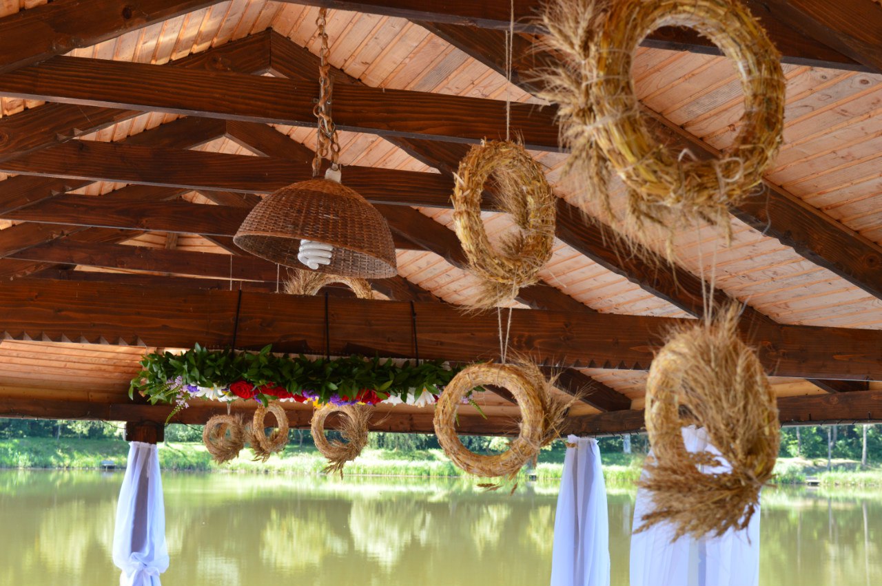 Оформлення виїзної церемонії було стилізоване під український колорит, саме для цього ми орендували садибу в Шевченківському Гаю і відтворили атмосферу справжнього українського весілля.